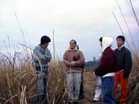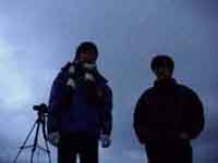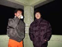 アズマの2ショット。マイペースなアズマと、早くも疲れてきた黒木兄弟(弟)。 (中央)ものすごい寒さと暴風を凌ごうと入った建物で一枚。不適な笑みを浮かべる アズマと、すでに限界が近い黒木兄弟(弟)。コーヒーをすすり、体温を回復させます。 それにしてもこの建物は、風が筒抜けでした(見れば分かる)。 (右)暴風の中で、シャッターチャンスを待つかっちゃん。この日は本当に寒かった。 |