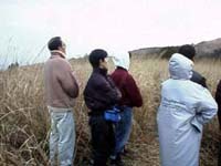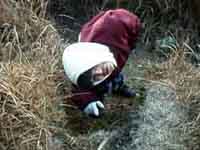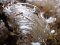 思わず逃げ出したくなりましたが、同じ穴の狢(むじな)なので、諦めます。 (右)ダンディー室伏が指差していたのは、霜柱でした。あまりの寒さに、 地面の水分が凍って、地表に出てきたようです。拡大写真の左上に、 氷の結晶が見えます。 |